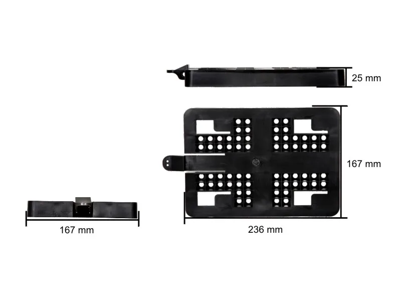 Medidas: Aproximadamente 236 mm de comprimento x 167 mm de largura x 25 mm de altura (veja a imagem com as medidas completas)