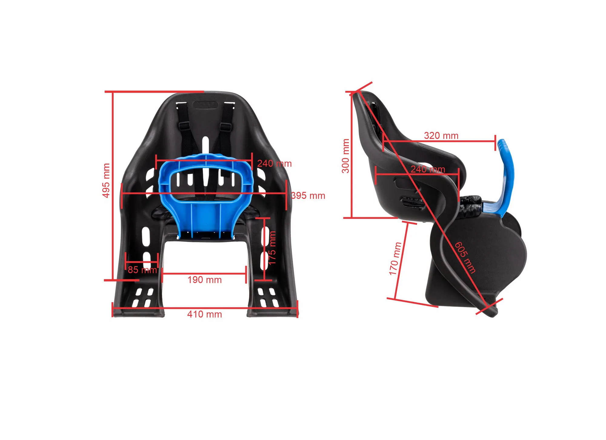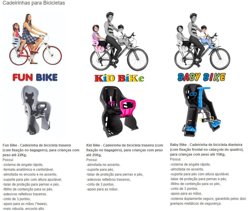 A Cadeirinha Kid Bike (KF402) é um modelo compatível com bicicletas aro 26", 27,5" e 29", própria para transporte de crianças que já sentam sozinhas com peso até 25kg, com fixação traseira e permanente no bagageiro - este precisa ser de qualidade, compatível, suportar o peso total a ser transportado e estar previamente instalado.