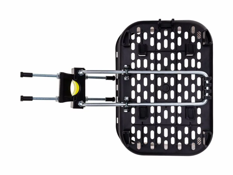 KF412 Cistella Dianteira = Fixação Dianteira, no Guidão. Fácil acesso e fixação adaptável. Gira com o guidão podendo causar instabilidade. Altura elevada em relação ao pneu.