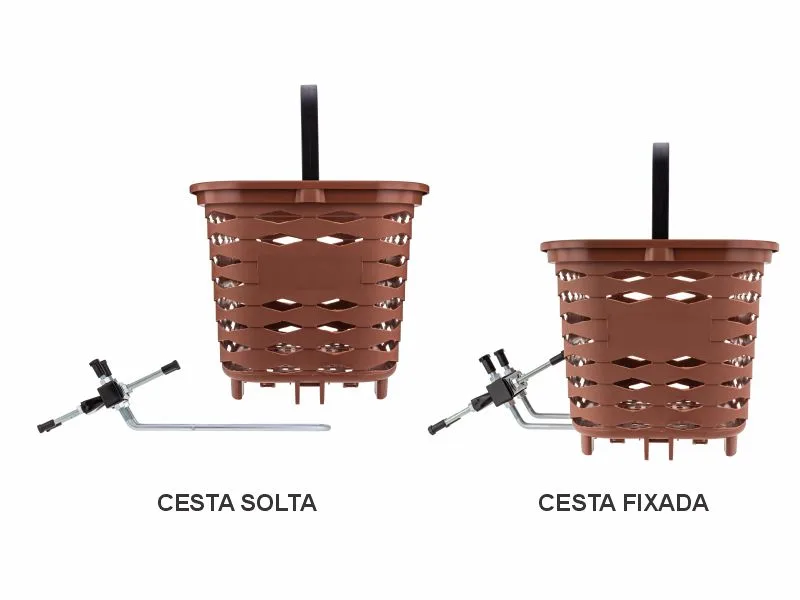 A fixação da cesta com a haste pode ser feito com os parafusos e porcas (que já vão no kit) ou com cadeados (comprados a parte), ideal para quem vai manter a cesta na bicicleta, sem intenção de retirá-la.