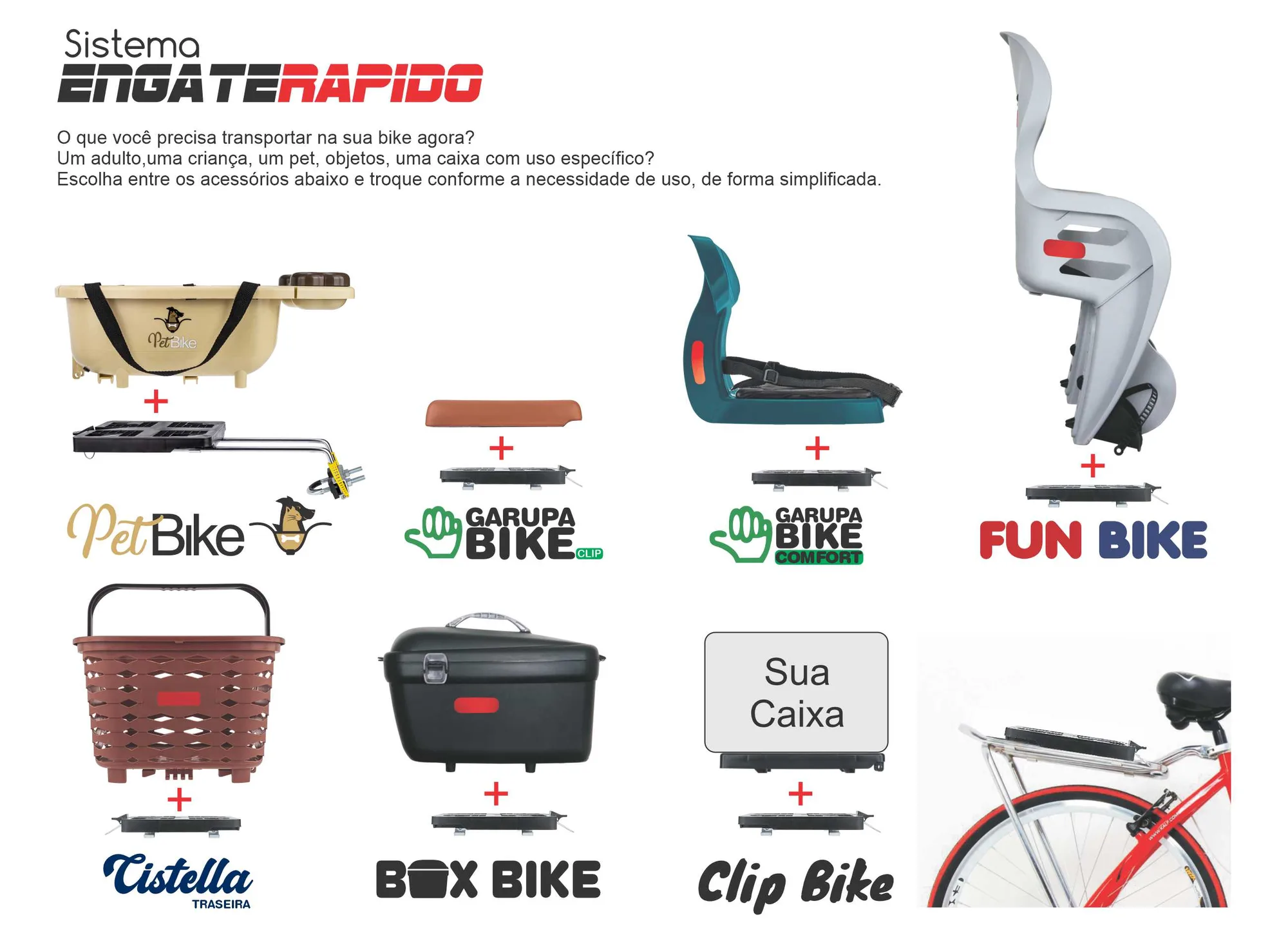 Sobre o bagageiro: É preciso ter um bagageiro compatível previamente instalado (comprado a parte). Para ser compatível, seu bagageiro deverá suportar o peso total a ser transportado (peso do produto + peso da carga a ser transportada) e ser compatível com as presilhas (estrutura tubular).