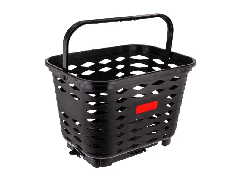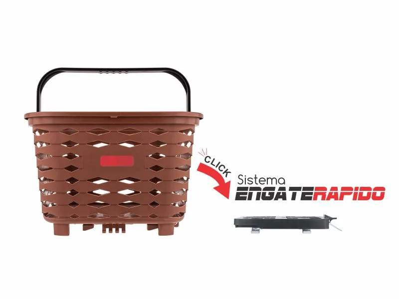 Cesta plástica traseira para bicicletas, ideal para quem usa bicicleta para mobilidade e lazer. Possui sistema de engate rápido para facilitar a fixação e a retirada da cesta conforme a necessidade de uso e alça para transporte fora da bicicleta.