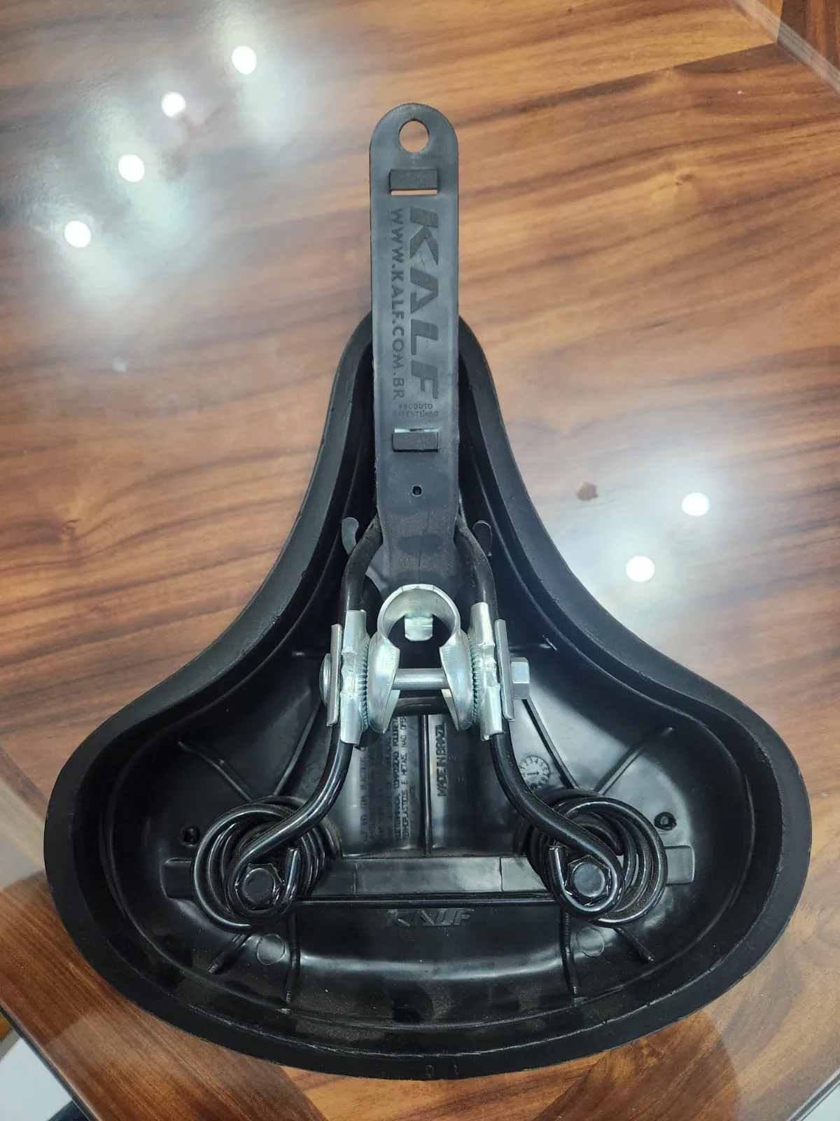 É possível usar esse suporte em selins com arames/trilhos, com molas e com base plástica (fixando no carrinho com uma abraçadeira de nylon).