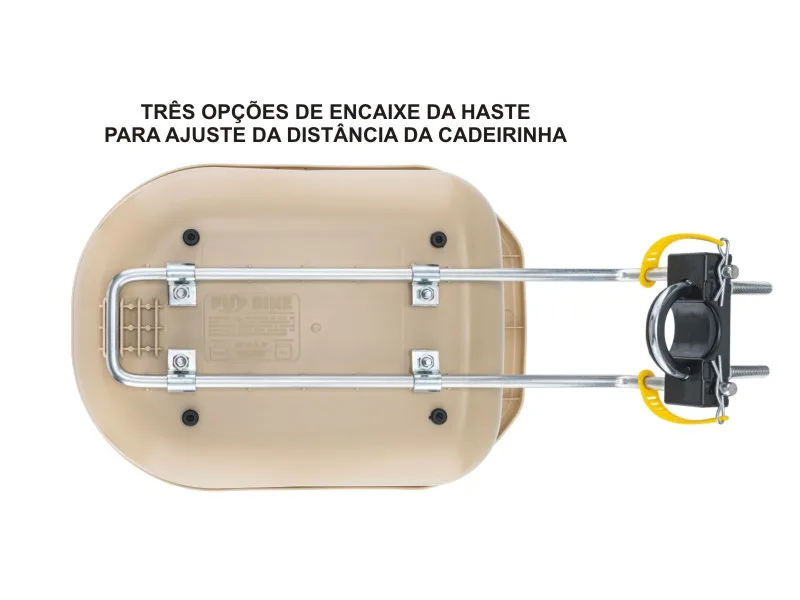 Embaixo da cesta existem 3 opções de encaixe da haste para ajuste do avanço/recuo em relação ao guidão, possibilitando escolher a posição que atenda melhor (conforto para o ciclista).
