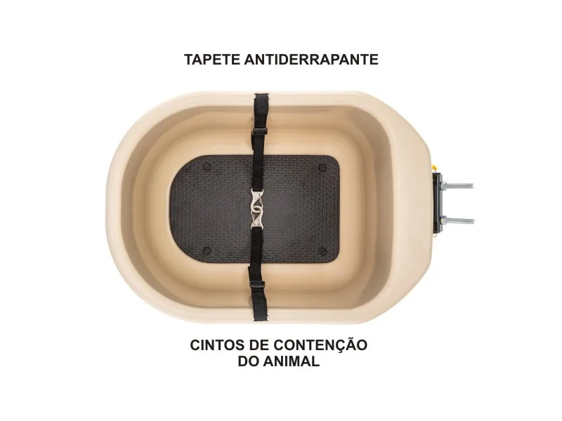 Para conforto do animal, as bordas da cadeirinha são arredondadas e o fundo é protegido por um tapete anti-derrapante.